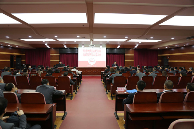 東風漸染綠樹,細雨催開繁花。十九大過後的第一個春天裡,伴随着“兩會”召開,國家各項事業發展迎來了新的戰略機遇期。在全面推進依法治國的進程中,第五次“修憲”成為舉國上下關注的焦點。為準确把握和透徹領會最新憲法修正案的内容和精神,真正把全面推進依法治國的戰略部署落到實處,2018年4月16日下午,局黨委在機關23樓會議室召開理論學習中心組擴大會議,特邀省委黨校法學教研部主任、碩士研究生導師傅大鵬教授就“維護憲法權威 加強憲法實施”進行專題講座。會議由局黨委副書記宋世東同志主持,局機關全體人員,局屬各單位領導班子成員、黨辦主任及長内單位黨員代表共計150餘人參加了現場學習。